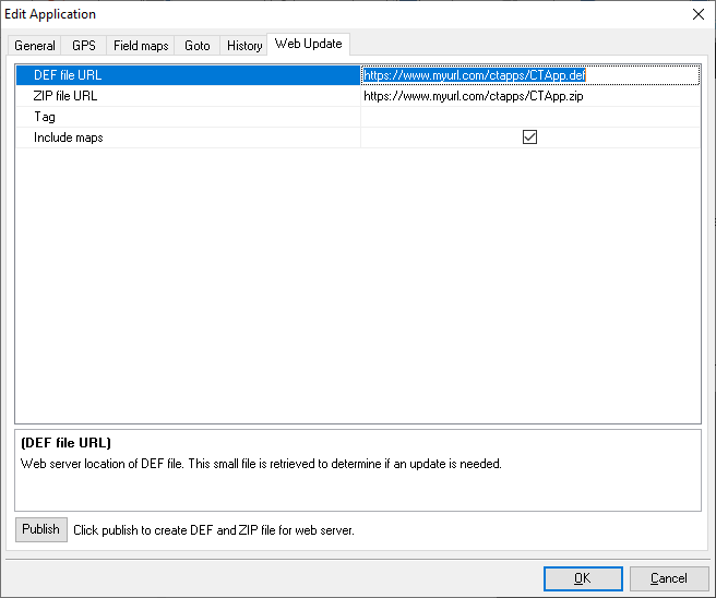 - On the CyberTracker desktop application, open the “Edit Application” dialog and go to the “Web Update” tab. Click the “Publish” button.