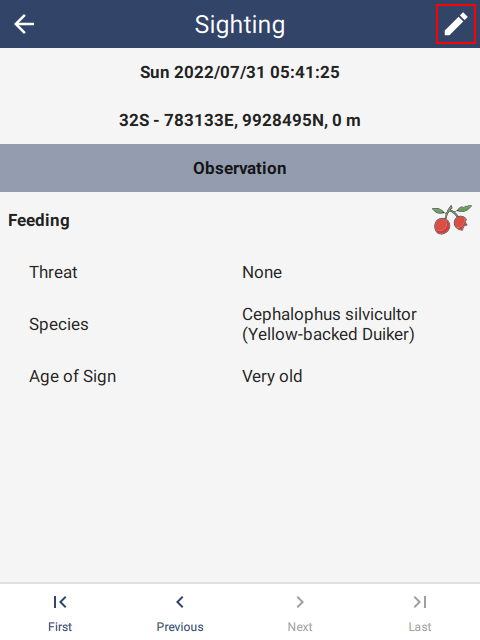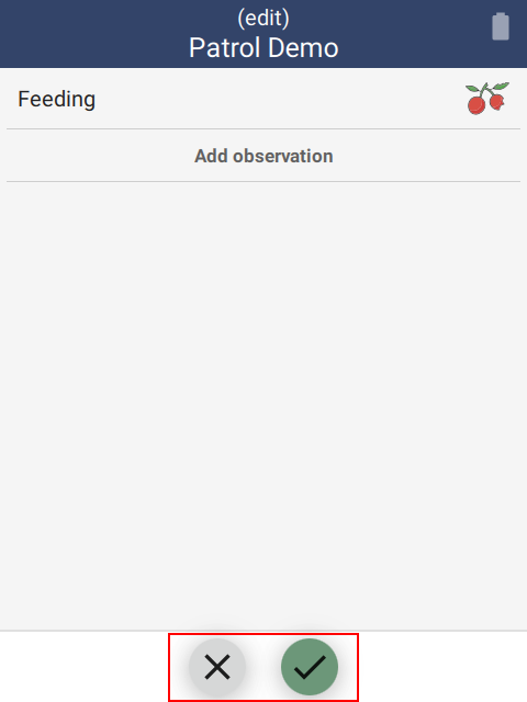 To edit an observation, locate it using Map identify or via the History page. Then tap the edit icon in the top right corner of the screen. The observation home screen will then be shown with two large buttons at the bottom. X cancels the edit and the check confirms any changes.