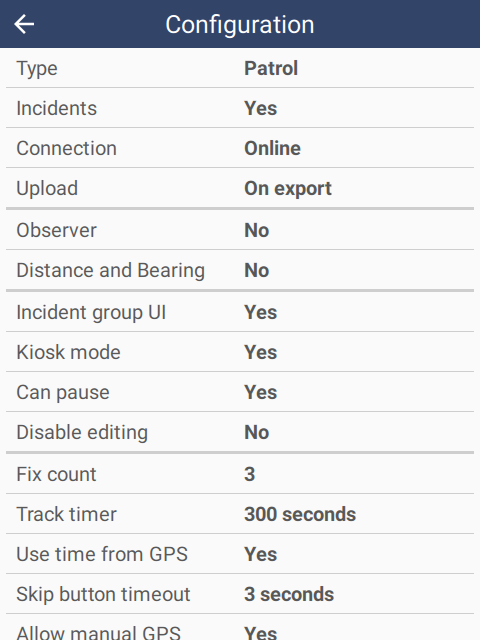 A Patrol or Survey is a group of observations. Along with observational data, the system tracks metadata, e.g. transport type, objective and employees. These properties can be configured on the desktop (see section 6). Patrols/Surveys can be started/stopped, paused/resumed and the metadata can be modified at any time.