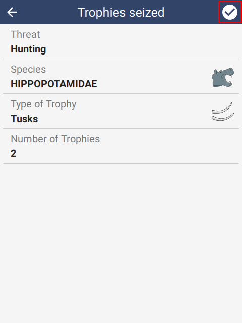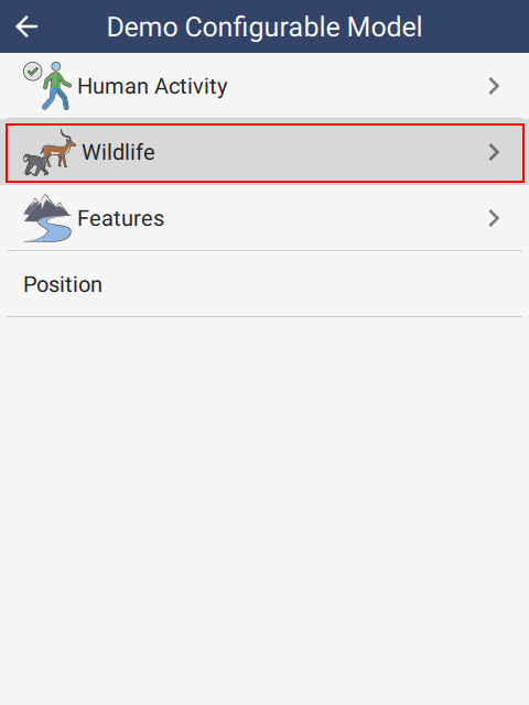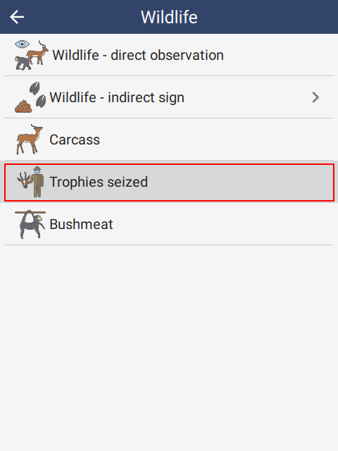 Make observation navigates the user to a data model selection page. Each option navigates the user through the model until a set of concrete questions are reached. For example, the user taps Wildlife then Trophies seized and then reaches a set of attributes to be completed.