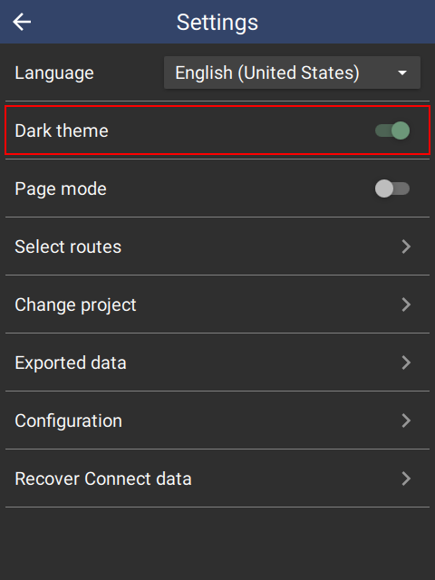 Light and dark themes are useful for improving the visibility of screen data. Dark theme is typically used for night viewing. It can also be toggled from the main settings page and the Patrol/Survey popup: