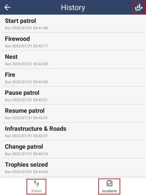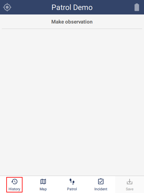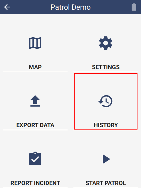History shows the most recent patrol/survey and incident data. There are two ways to access the history: directly from the start page with the HISTORY button or using the History button on the bottom toolbar during a patrol/survey.
