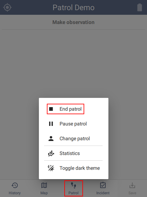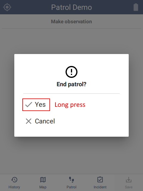 To end a patrol, tap the Patrol button on the toolbar at the bottom of the Observation page. Then tap the End patrol option. A popup will appear asking for confirmation. Press and hold Yes. A final location will be taken and then the patrol will be completed. If the back button is pressed on the Acquiring location page, then the End patrol operation will be canceled.
