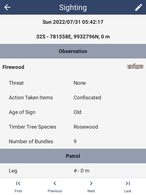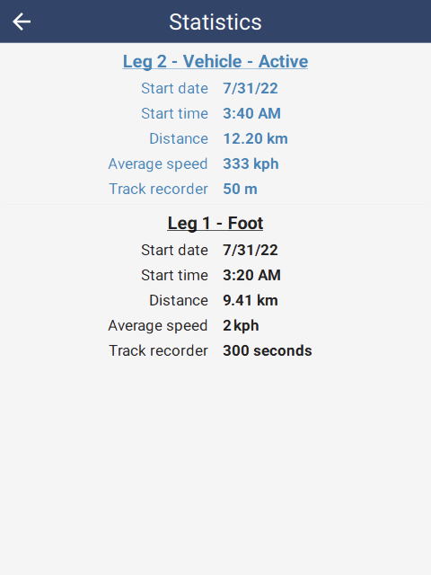 SMART Mobile keeps track of the legs of a patrol. To see these, tap the Patrol button on the bottom toolbar of the Observation page. Then tap the Statistics button to view the patrol state. Each change of the patrol metadata will result in a new leg. The current leg is topmost and highlighted.