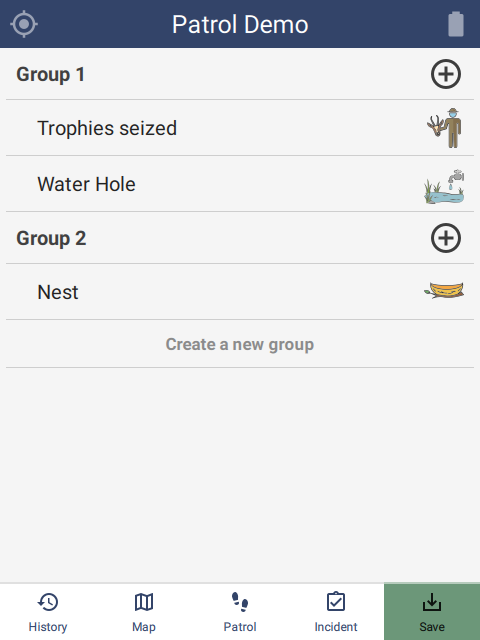 If Incident Group UI is enabled in Device Settings (see section 6.5.1.1.), then the process of creating new observations is different. In this case, observations are organized into groups. Tapping the ’+’ sign will add a new observation to that group. Tapping Create a new group will add a group.