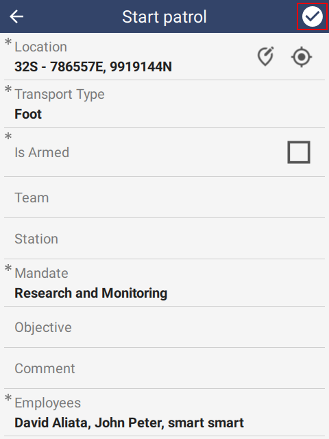 To start a new patrol, tap START PATROL on the project start page. The metadata page will appear. Fill in the metadata and tap the check mark in the top right corner. Note that attributes marked with a ‘*‘ are required. If the Transport Type is an air or water type, then a Pilot row will appear.