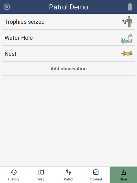 After tapping the check in the top right corner of the screen, the observation will appear on the observation home screen. Note that the Save button is now enabled. Other observations can be added using the Add observation button.