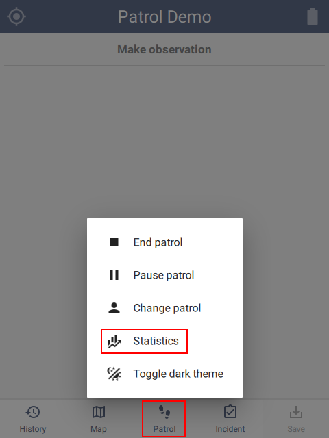 Statistics can be accessed using the button in the top right corner, even after the patrol/survey has ended.