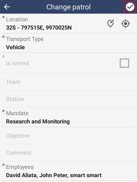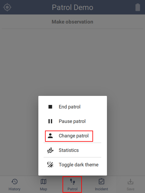 During the patrol, it is often necessary to change the patrol metadata. For example, if the transportation type changes or team members change. To do this, tap the Patrol button on the toolbar at the bottom of the Observation page. Then tap the Change patrol option to bring up the metadata page. Several attributes will be disabled and cannot be changed at this time. If no change is made to the metadata, no observation will be saved. This means that the Change patrol feature can be used to verify the metadata at any time.