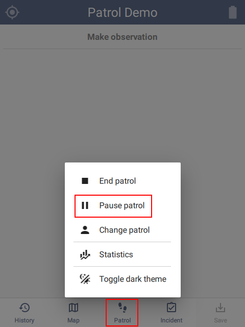 To pause a patrol, tap the Patrol button on the toolbar at the bottom of the Observation page. Then tap the Pause patrol option. A location will be taken and then the patrol will be paused. The START PATROL button is now labeled RESUME PATROL.