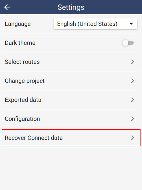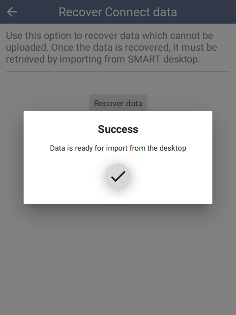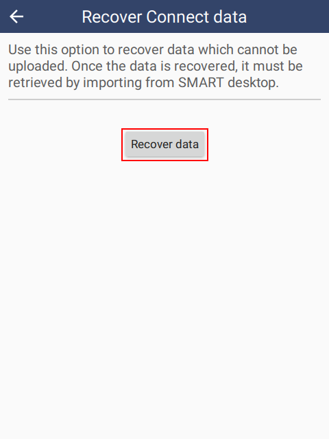 If SMART Mobile is configured to send data to SMART Connect and the Connect server is not available, outstanding data can be recovered using the Recover Connect data option off the Settings page. All the data that would ordinarily have been sent to Connect is exported to a file. This can then be downloaded over USB cable or shared using another channel (see Recovering Exported Data above).