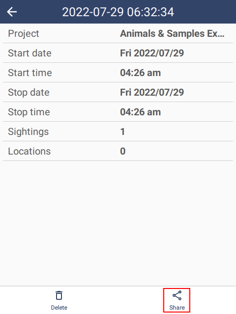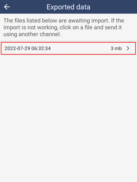 SMART data is exported to JSON files. If the normal import operation is not functioning, then it is possible to retrieve the JSON files from the device and import them manually. To do this, go to the Settings page and tap Exported data. Then tap the file to retrieve and the Share button. This will open the sharing options for the device. Send the file through another channel and copy it to the SMART Desktop computer.