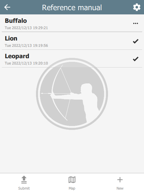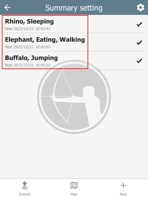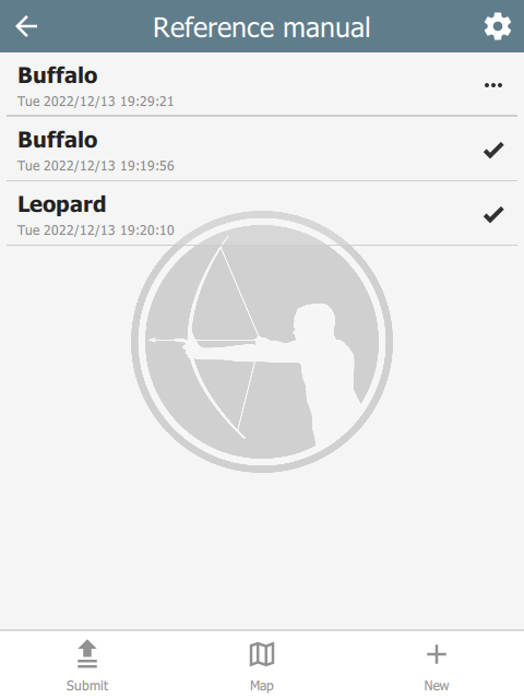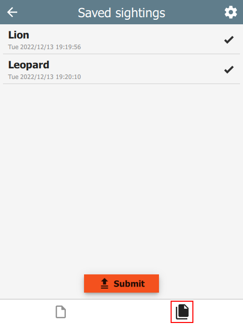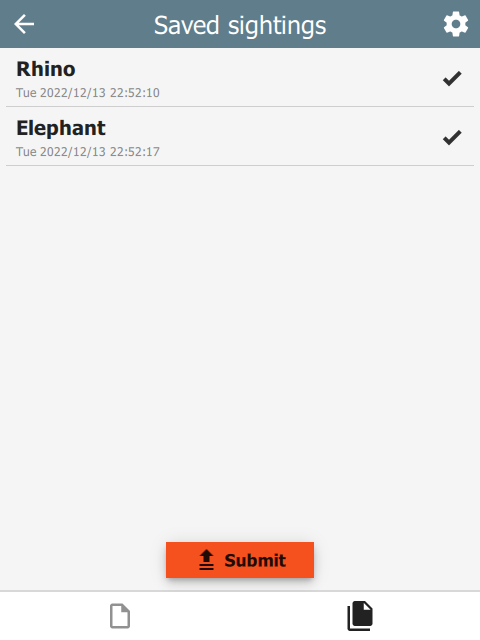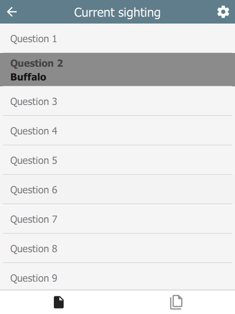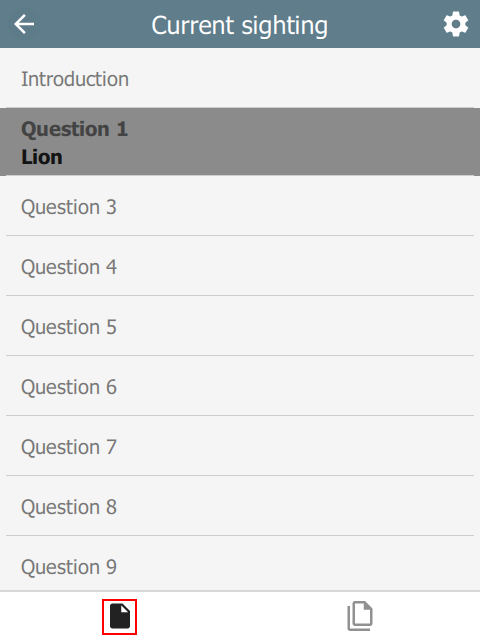 In the table below, the user context is always within a sighting and each page typically holds one question. Pressing the options button (highlighted in the first image) navigates to a new page which shows the current sighting on one tab and all sightings on the other. The user can edit previous sightings, but when editing is complete, the wizard will revert to the original sighting.