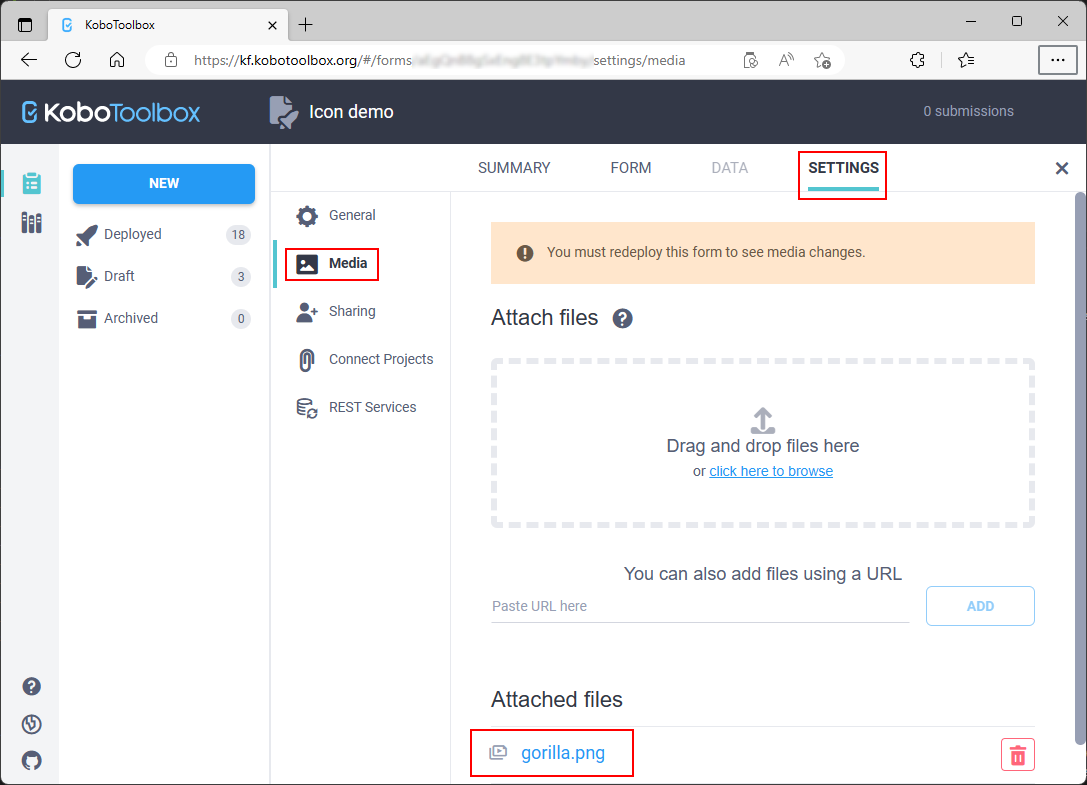 The icon image should be added to the form as an attached media file. In KoBoToolbox, this is done under the form settings option:
