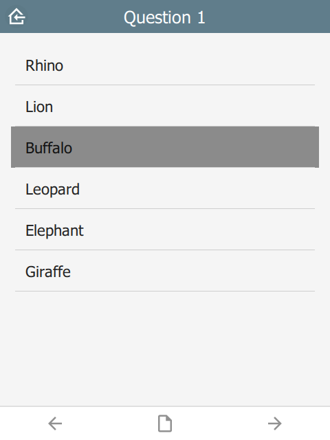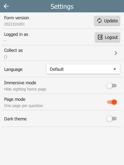 If wizardMode is set to yes, then each question will appear on its own page with Back and Next toolbar buttons to navigate between questions. The user will still return to the Home page between sightings. wizardMode appears on the Settings page as Page mode.